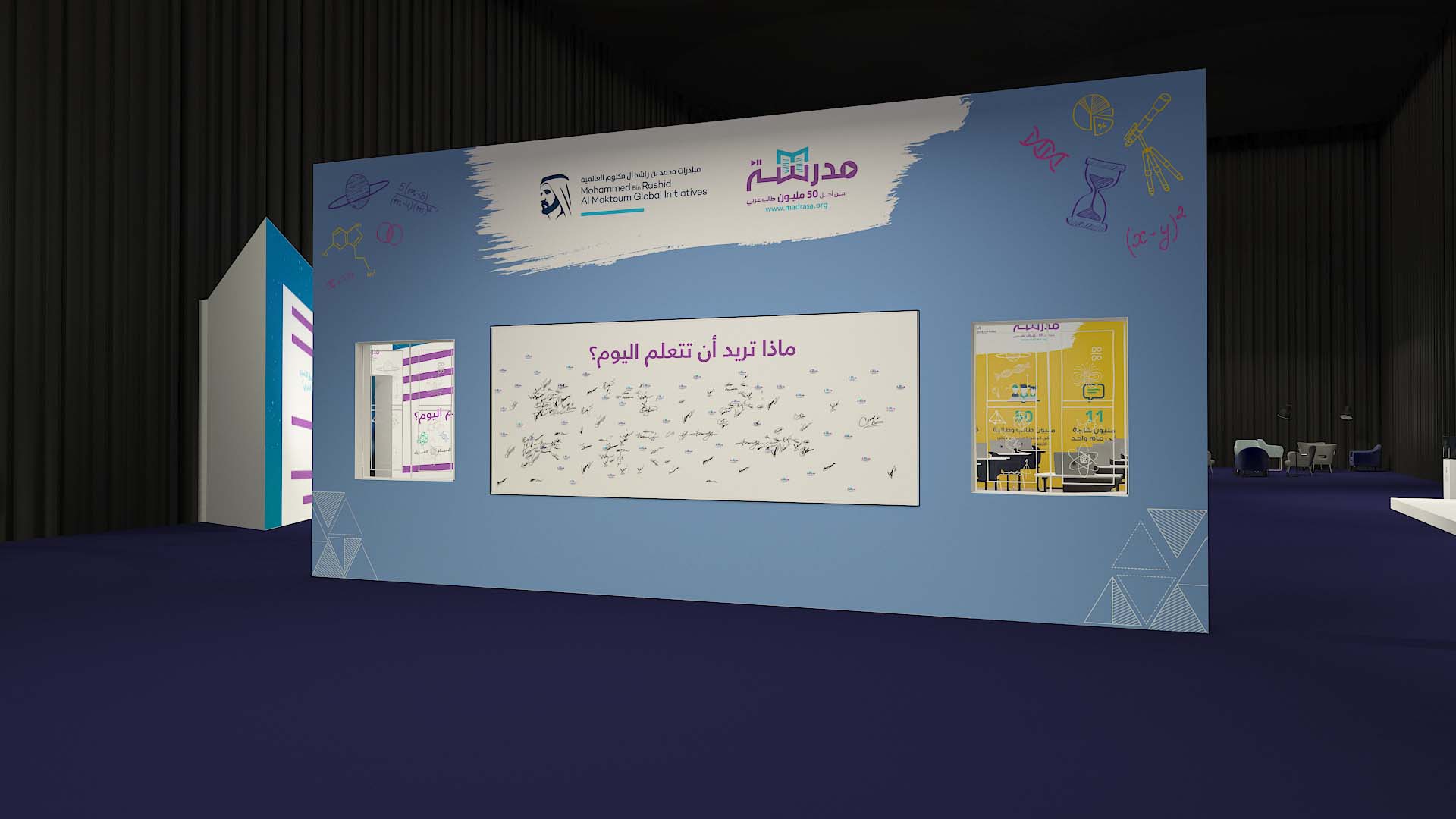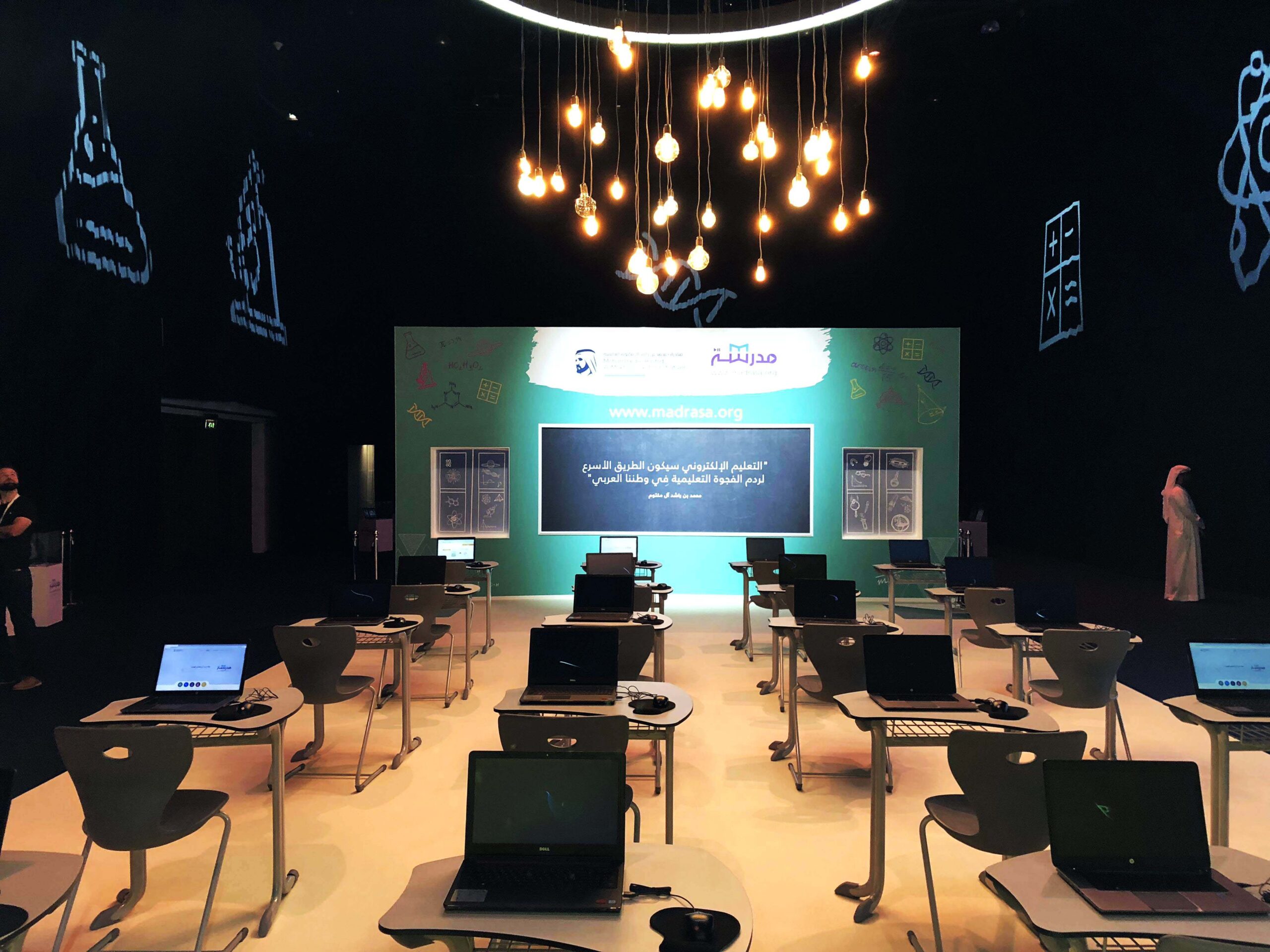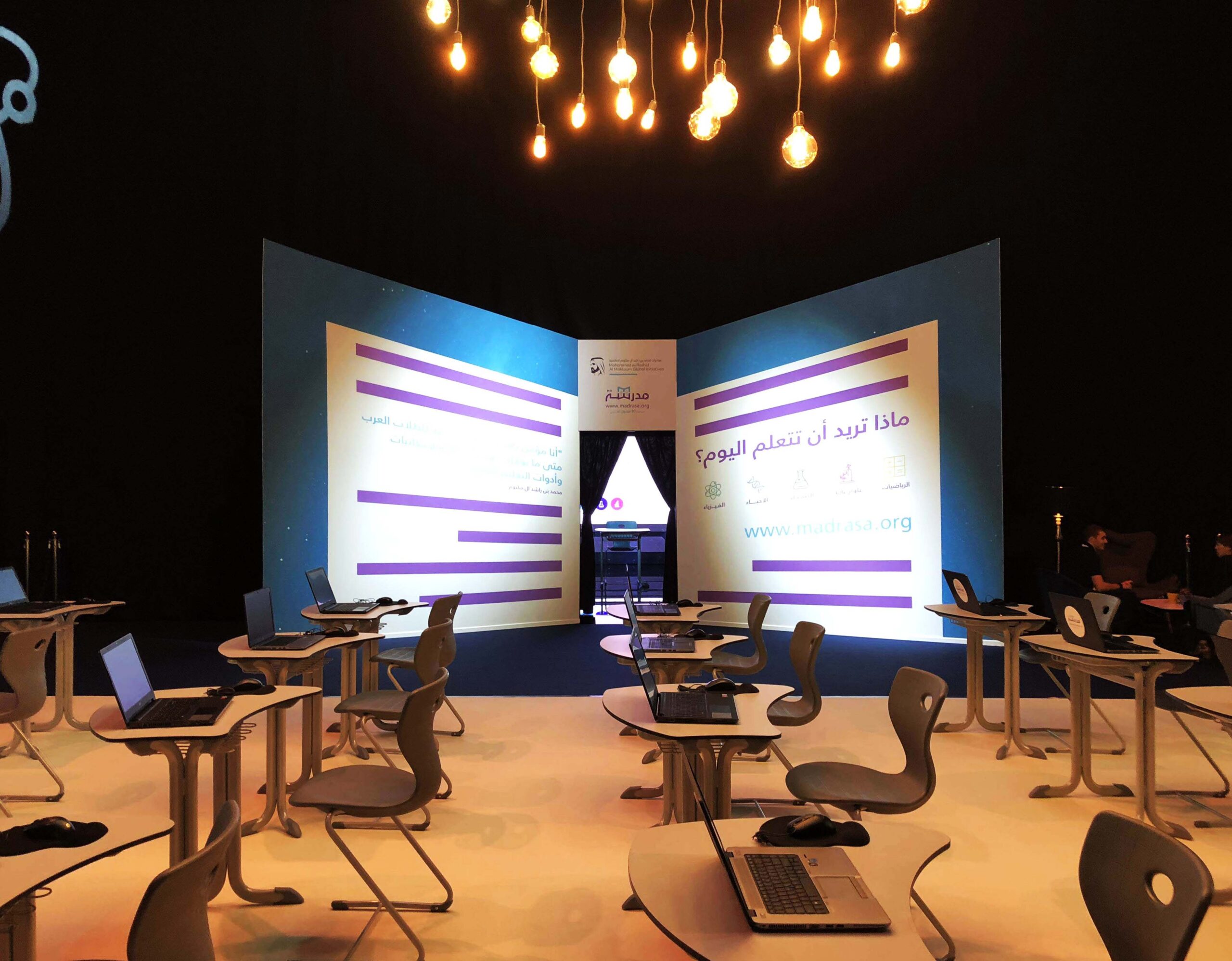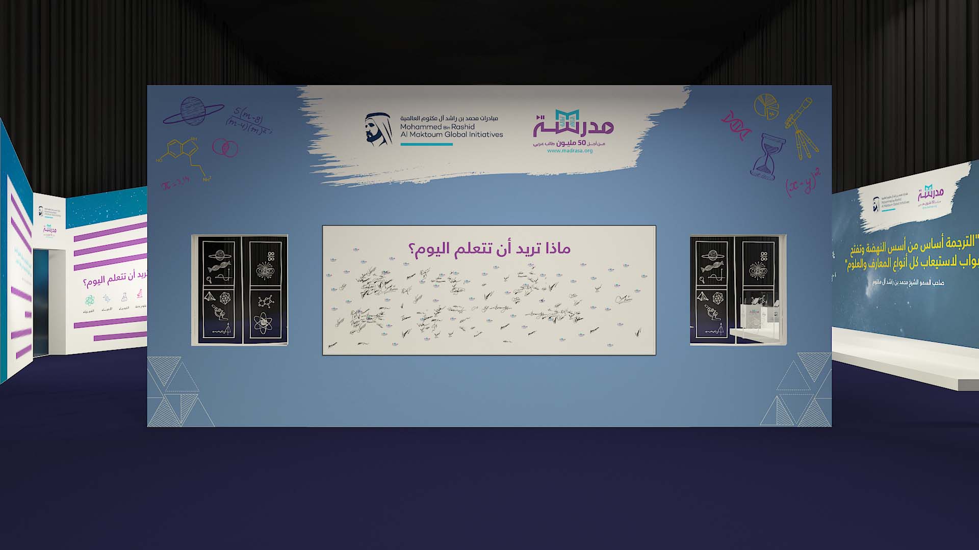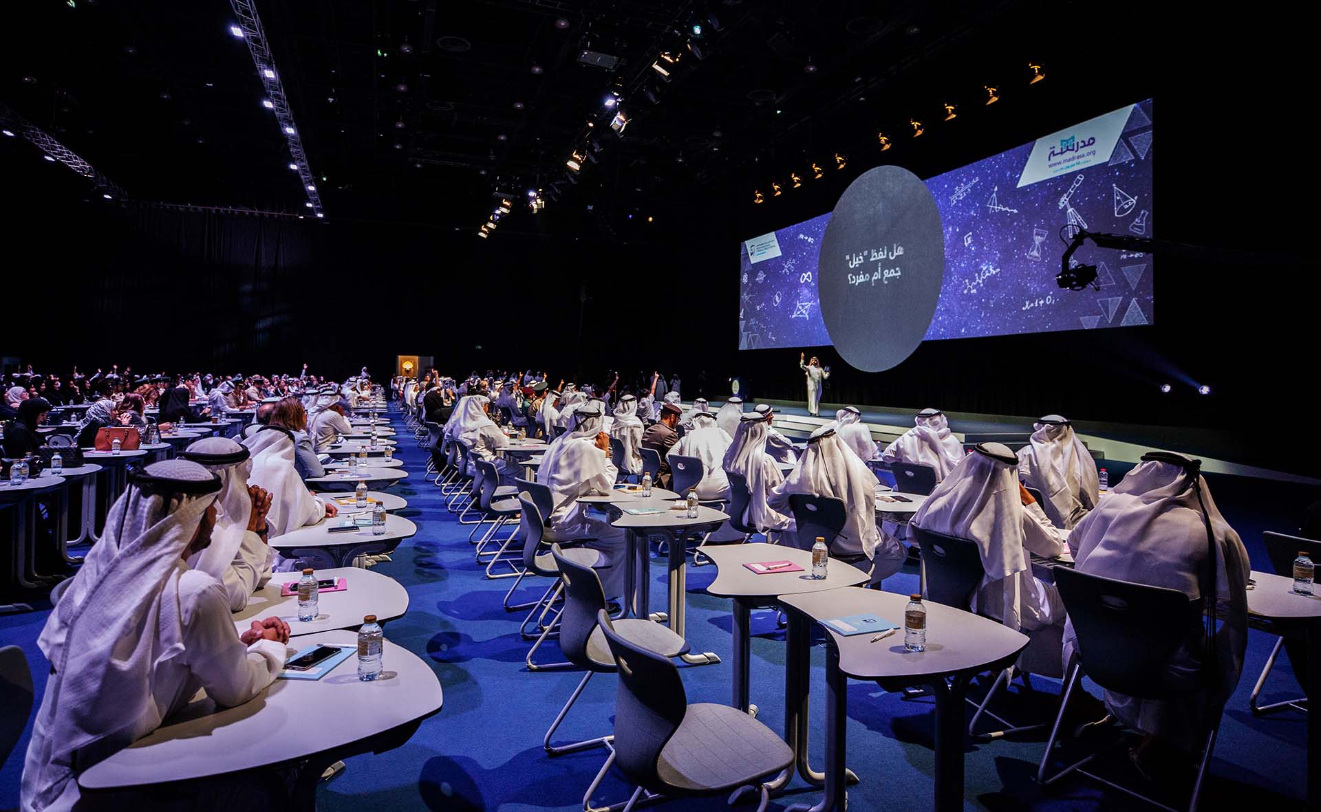 The design of this event built upon the existing school theme, marking the launch of the second phase of the successful translation initiative. Scenographic elements were carefully selected to enhance the experience and encourage audience participation. The event commenced with a trigger from His Highness, who inaugurated both the event and the online platform from an immersive environment projected onto the main screen.